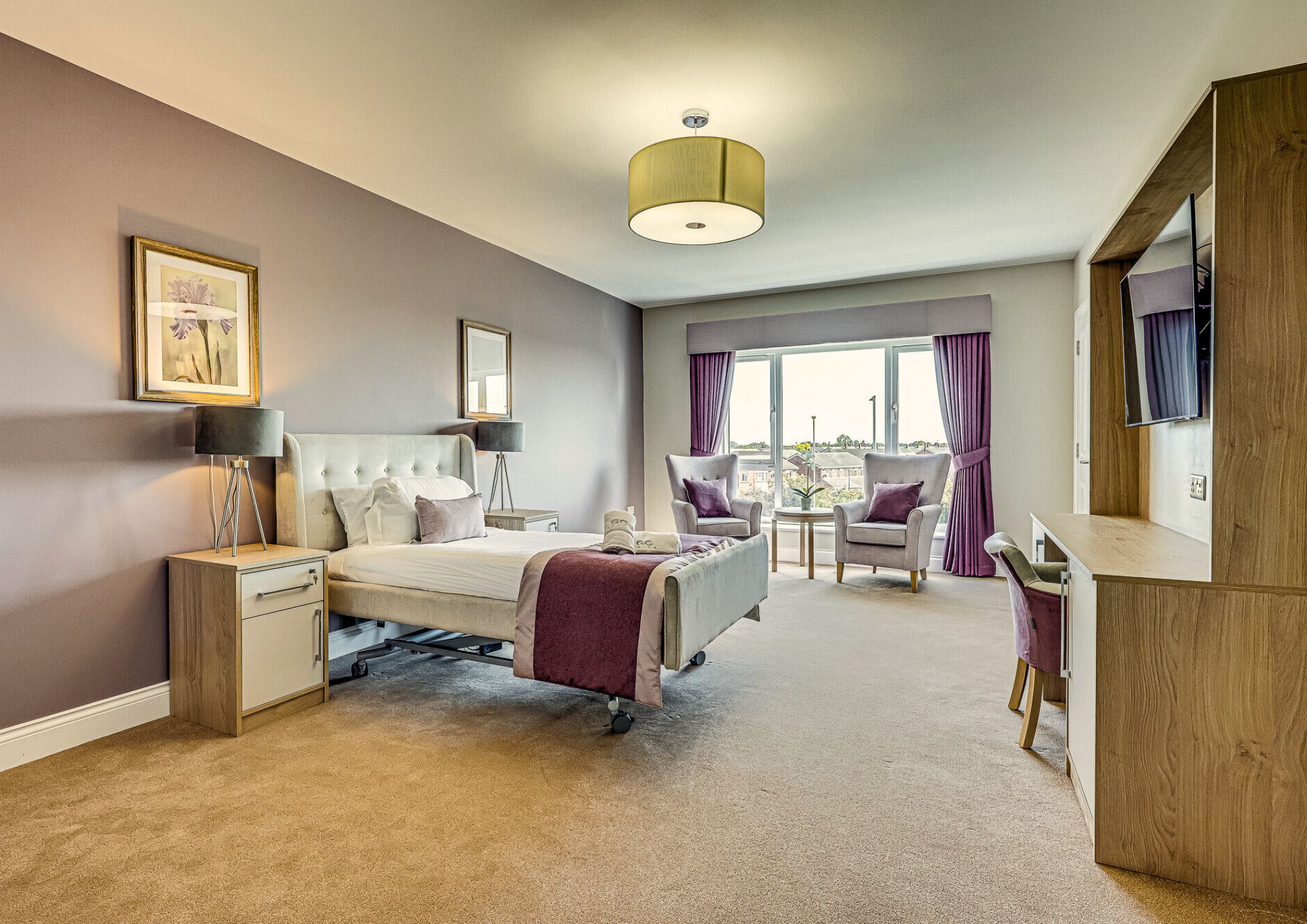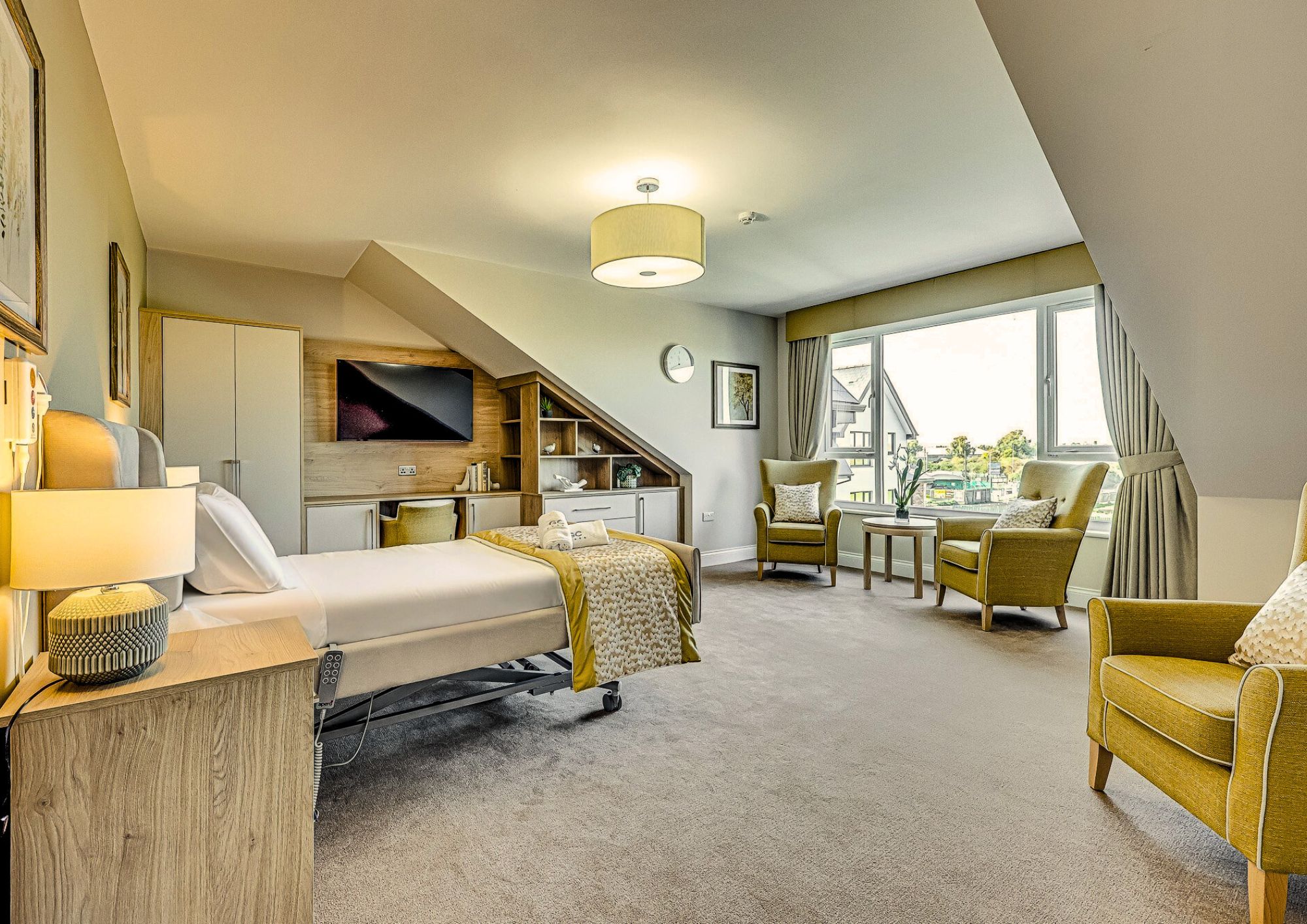 Grace Court offers a range of fully furnished ensuite bedrooms, featuring adjustable beds and comfortable sofas. Each suite includes spacious wardrobes, ample seating, and a TV, with room to add additional furniture if desired.
